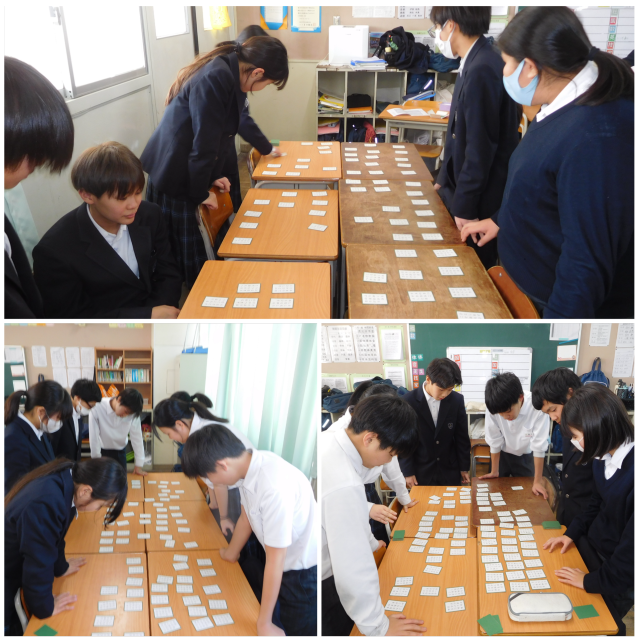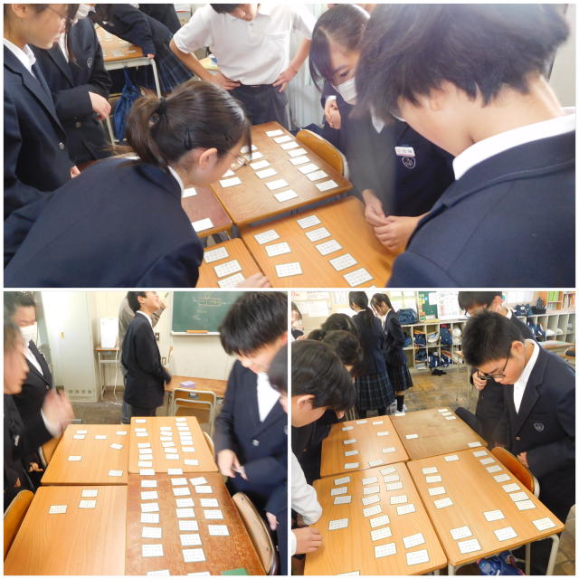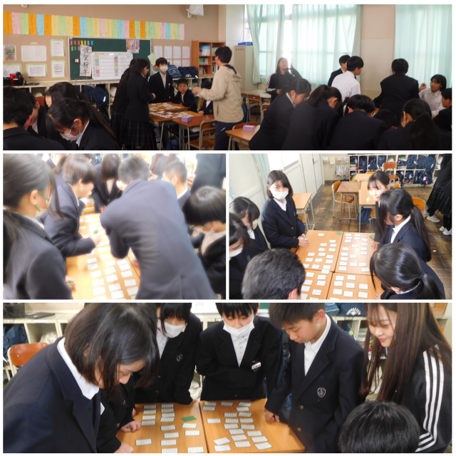 1年生が百人一首大会にむけて教室で練習しています。上の句だけで札を取っている人もたくさんいました。