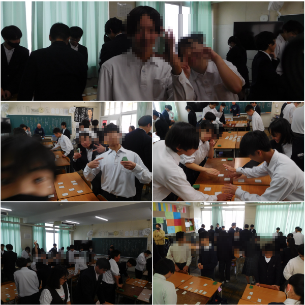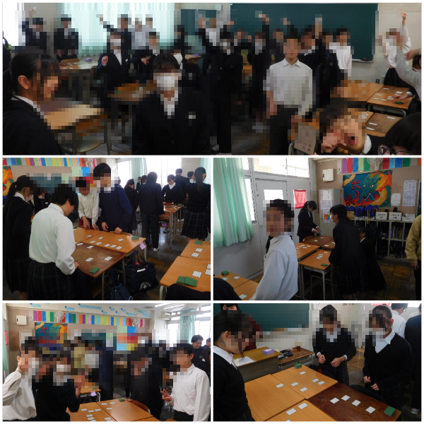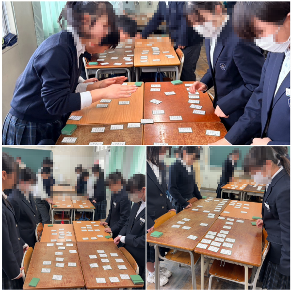 2年生が各教室で百人一首の練習をしています。上の句が詠まれただけで取る人もいて、どちらの教室も盛りあがっていました。