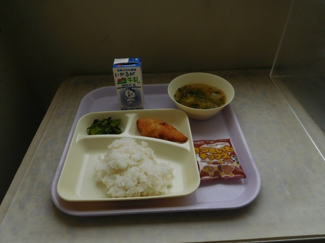 本日の給食は、たらフライ、うすくず汁、こまつなのごまあえ、おさつチップスでした。たらフライはとても柔らかく、骨もなく食べやすかったです。今日もおいしくいただきました。ごちそうさまでした。