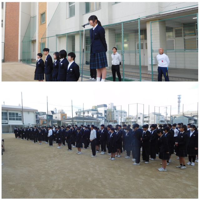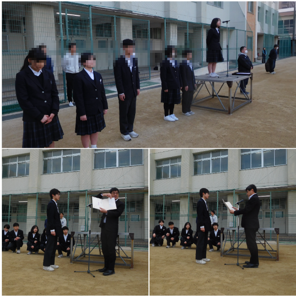 本日は朝からグラウンドで全校集会を行いました。バドミントン部の表彰伝達のあと現代百人一首に応募し、みごと入選した2年生の人へ表彰伝達を行いました。応募総数5万点を超える作品の中から100選しか選ばれないという激戦のなかの価値ある入選です。おめでとうございます。