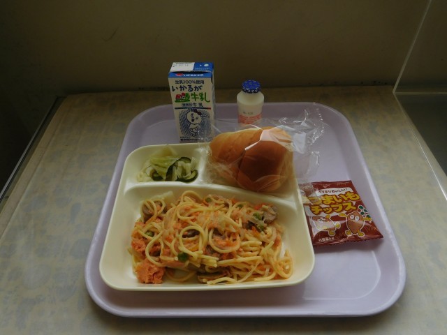 本日の給食は、さけのスパゲッティ、キャベツときゅうりのサラダ、おさつチップス、発酵乳でした。意見は分かれると思いますが、スパゲッティはパンにはさんで食べてもおいしかったです。