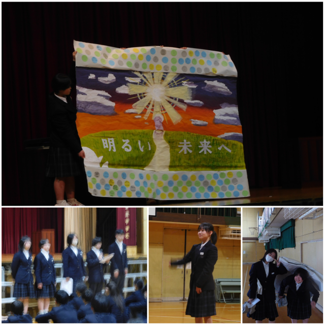 そして最後は、1,2年生制作の作品「明るい未来へ」を披露してくれました。卒業まで玄関ホールに飾られます。