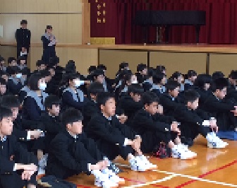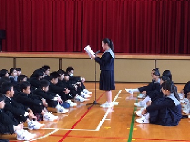 始業式に続いて、中学生のみ残って、「対面式」を実施しました。生徒会役員の進行で、まずは、新入生代表のことば・・・。