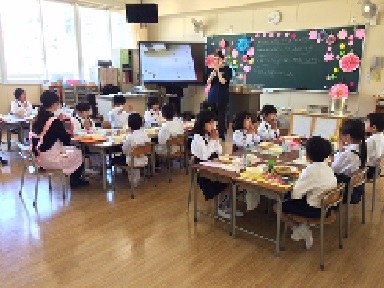 写真は、1年1組の様子です。みんなで「いただきます!」