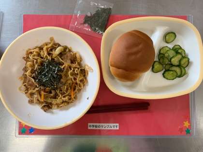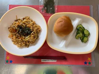 今日の給食は、「黒糖パン、焼きそば、きゅうりのしょうがづけ」、中学生には「ぶどうゼリー」が加わります。