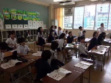 2年生の教室から、元気な歌声が聞こえていました。写真は、2年1組の音楽の時間の様子です。2年生の音楽の教科書に、「あそびうたを きいたり うたったり しましょう。」の単元があります。今日は、「子犬の ビンゴ」を歌っていました。最初は、みんなで元気よくうたった後、班わけしました。Bの班、Iの班・・・という感じに分けて、歌いながら、BINGO(ビー アイ エヌ ジー オー)の歌詞のところで、自分の班のアルファベットの時に立ちます。楽しそうに、歌っていました。