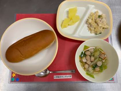 今日の給食は、小学校と中学校共に「黒糖コッペパン、マカロニグラタン、レタスのスープ、りんご(カット缶)、牛乳」です。