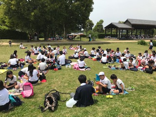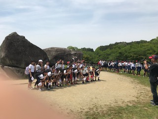 オリエンテーリングを終えて、お弁当タイムです。石舞台で集合写真も撮りました。