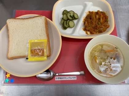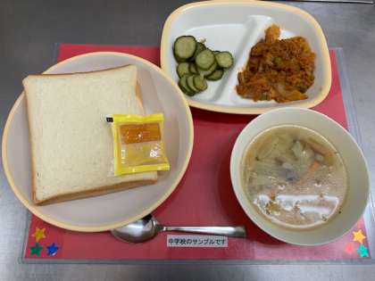 今日の給食は、小学校と中学校共に「食パン、牛乳、じゃがいものミートグラタン、スープ、きゅうりのピクルス、アプリコットジャム」です。
