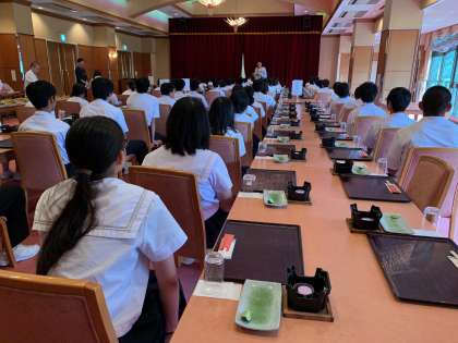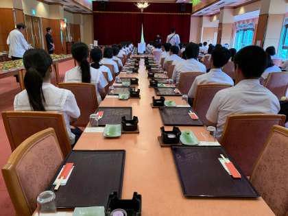 ホテル秘湯の湯に到着しました。入館式で、お世話になるホテルの方に挨拶しました。