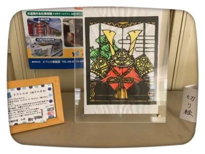 職員室前に美術部の作品が展示されています。5月の季節を表現して「子どもの日(端午の節句)」を題した9年生部員の切り絵作品です。