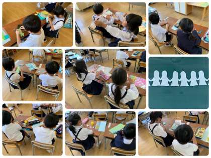 1年2組の図工の時間の様子です。色紙を折って切って・・・どんな形ができあがるかな?素敵な作品がたくさんできていました。