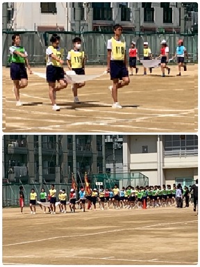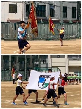 続いて、入場行進の練習です。音楽に合わせて、最初に国旗・エンブレム旗・優勝旗が入場します。