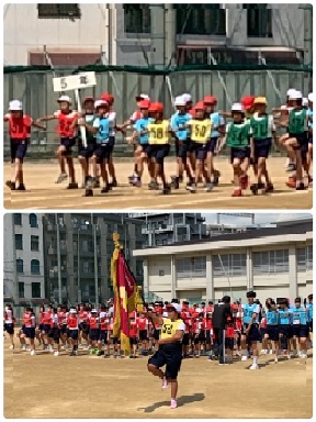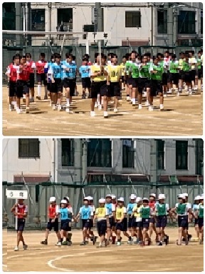 入場行進は、9年生から始まり、8年生・7年生・6年生・5年生と続きます。胸を張って、手を振って、元気よく入場してきます。