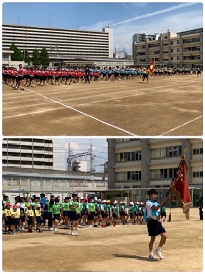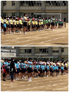 入場行進に続いて、開会式の練習。その後、準備体操・小学生による応援合戦と進んでいきます。