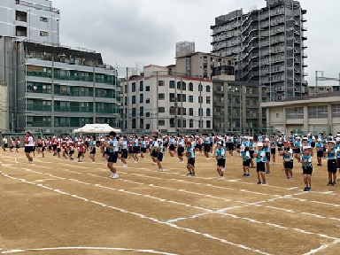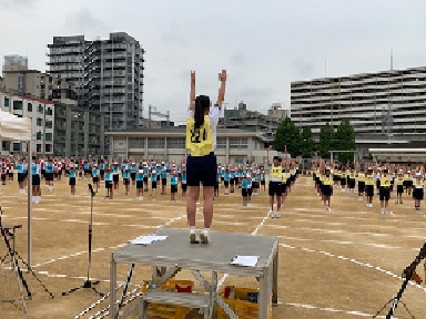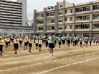 入場行進に続いて「開会式」、そして、プログラム1番「ラジオ体操」です。1年生から9年生まで全員で、ラジオ体操をします。