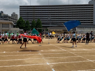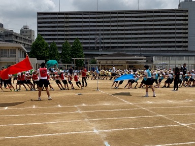 続いて高学年の出番です。中学生が応援旗を持って応援に入ります。