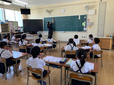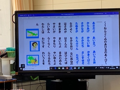 1年2組の国語の学習の様子です。単元「あひるのあくび」の学習で、「1年2組のあひるのあくびを考えよう」をめあてに進めています。今日の授業でた行までできあがっていました。児童のセンスが光る楽しい「あひるのあくび」ができあがりそうです。