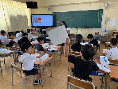 2年1組の図工の学習の様子です。「えのぐをつかってみよう」をめあてに進めていました。
