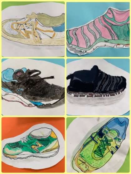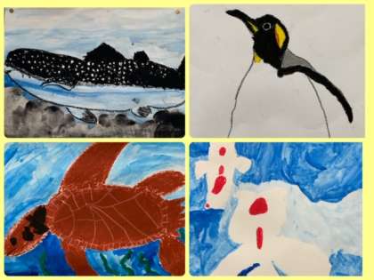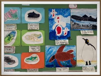 階段の掲示板に掲示されている3・4年生の図工作品(代表作)です。