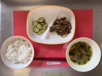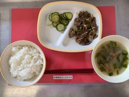 今日の給食は、小学校と中学校共に「ご飯、牛乳、チンジャオニューロウス—、ハムと野菜の中華スープ、きゅうりの辛みづけ」です。