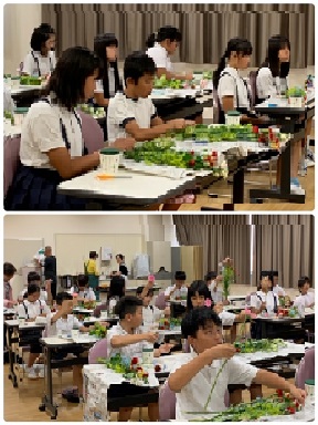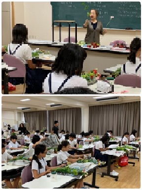 次は、「お花体験」です。先生からポイントを説明してもらって、それぞれが、自分のイメージするフラワーアレンジメントを創っていきました。