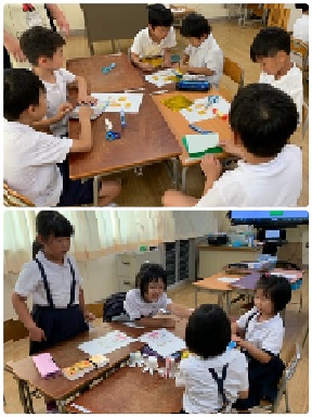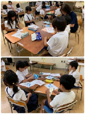 2年1組の図工の時間の様子です。今日は、もうすぐ七夕ということで、様々な「七夕飾り」を作っていました。色とりどりの折り紙を使って、きれいな飾りができていきました。