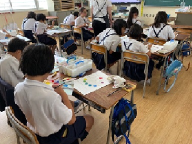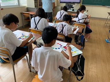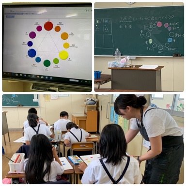 5年1組の図工の学習の様子です。いまみや小中一貫校では、高学年(5・6年生)の図工の時間に、中学校美術科の先生が実技指導をしています。今日の学習のめあては、「3原色(赤・青・黄)でいろいろな色をつくろう」です。5年生は、試行錯誤して色を作っていました。これができるようになると、水彩画に生かすことができるようになります。