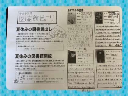 中学生図書委員による「図書だより」が、本日、配布されています。「図書だより」の中では、夏休みの図書貸し出しについて、夏休みの図書館開放についてお知らせしています。さらに、図書委員おすすめの本の紹介もあります。