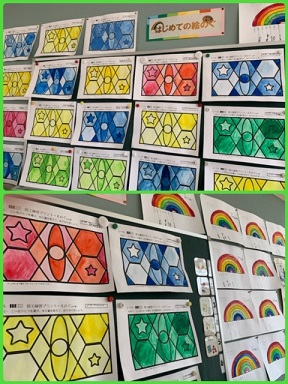 2年2組の図工作品「はじめての絵のぐ」が、教室の後ろに掲示されています。