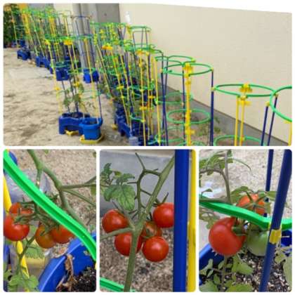 中庭で育てている2年生のプチトマト。少しずつ実りが見られるようになってきましま。これから、たくさんできていくかな。楽しみです。