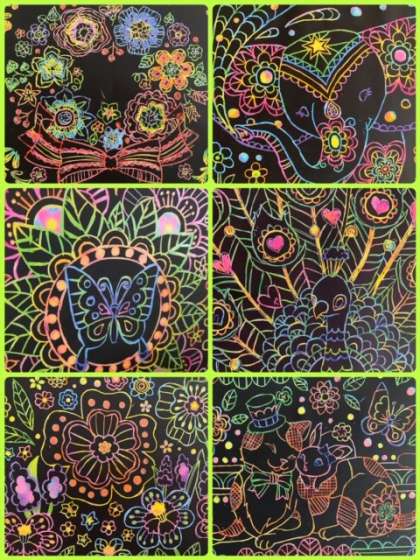 小学生のクラブ活動で、創作クラブが「スクラッチアート」作品を作りました。「スクラッチアート」とは、アメリカをはじめとする海外で大ブームとなり、今では、いろいろなシリーズがあるそうです。黒い面の下に美しい色が隠れており、ペンなどで削ることで、様々なデザインが描けるようになっているようです。今、職員室前に創作クラブの児童の作品が展示されています。