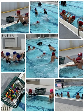 7月22日(月)、今日から夏休みのプール開放が始まっています。写真は、低学年のプール開放の様子です。どちらのチームがたくさん集められるか競争をしています。楽しみながら、顔を水につけることや水にもぐることに慣れていきます。