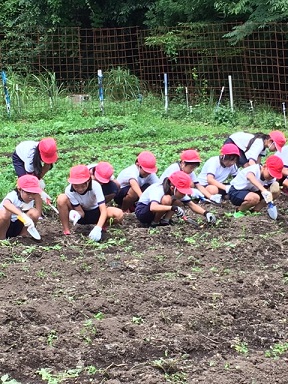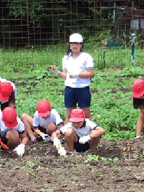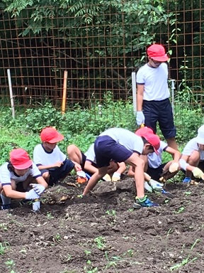ジャガイモ堀りをしています。収穫したジャガイモを使って、この後、飯盒すいさんでカレーライスを作ります。