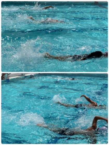7月26日(金)、高学年のプール開放の様子です。まずは、25mのクロールを泳いでいます。