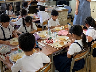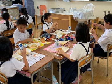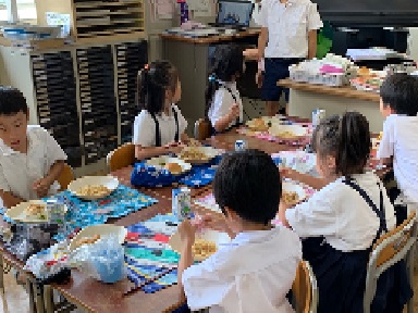 1年2組の2学期最初の給食の時間です。みんなで楽しく!