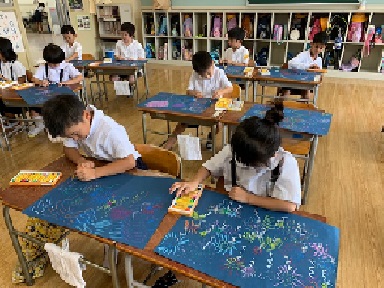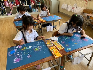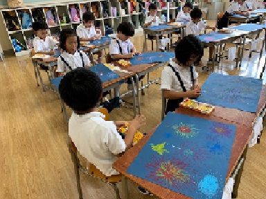 1年1組の図工の授業の様子です。夜空に輝く「花火」を描いています。