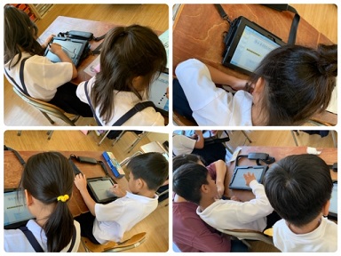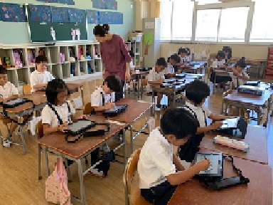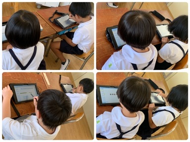 1年1組の算数の授業の様子です。今日のめあては、「9+4のけいさんのしかたを かんがえよう」です。これまでブロックを使って計算してきましたが、今日は、ブロックを使わないで計算する方法を考えています。一人一台のタブレットを使って考えました。