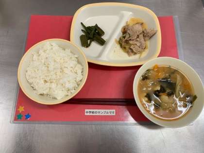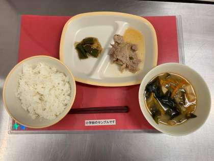今日の給食は、小学校と中学校共に「ご飯、牛乳、豚肉の甘辛焼き、みそ汁、オクラのおかかいため」です。