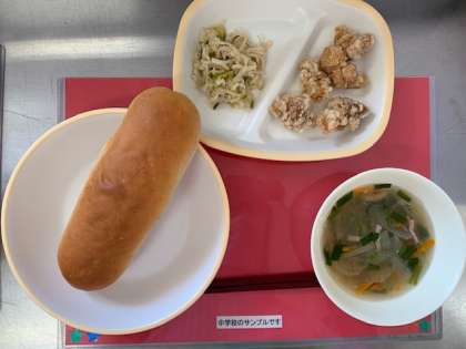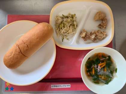 今日の給食は、小学校と中学校共に「黒糖パン、牛乳、鶏肉のからあげ、とうがんの中華スープ、切干しだいこんのごま辛みづけ」です。