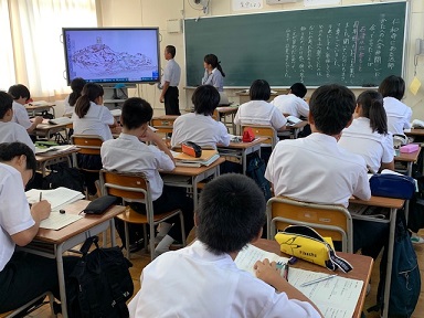 8年2組の国語の授業の様子です。今、8年生は古文「徒然草」の学習をしています。今日は、「仁和寺にある法師」の部分を呼んで学習を進めていました。法師は仲間に会ってこう言いました。「長年思っていたことを果たしました。〜」長年思っていたこととは、参拝することでした。しかし、他の人が山に登るのを不思議に思いながら、法師は参拝を終えた様子。文章を読みながら、法師がたどった道を絵図で確認していました。