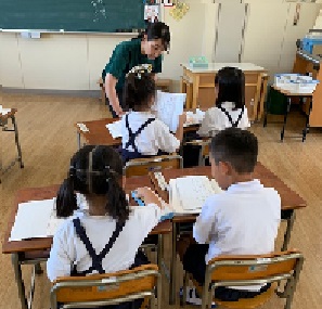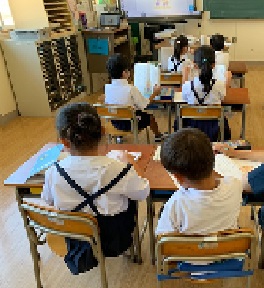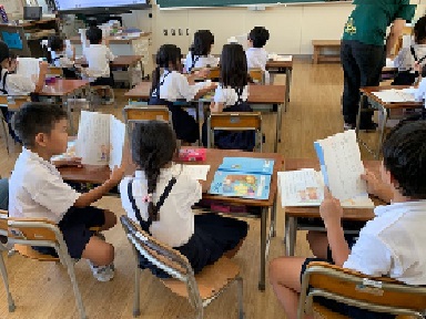 1年2組の国語の授業の様子です。今日のめあては、「クイズをだしあって、ぶんからこたえをさがしだそう。」です。題名「かいがら」の本文を読んで、クイズを考えました。ペアで、互いに作ったクイズを出しています。クイズの答えを考えるには、再度、本文を読んで考えます。クイズの数だけ、本文を読み返すことになります。きっと、読み返した分だけ、本文の内容を深く理解できていくのでは・・と期待しています。