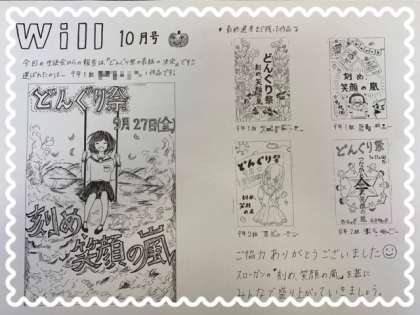 さて、昨日、生徒会新聞「Will」で、『どんぐり祭』のプログラム表紙デザインが発表されました。最終選考に残ったデザインは、とてもすばらしく、その中で選ばれて表紙デザインは、とても素敵です。