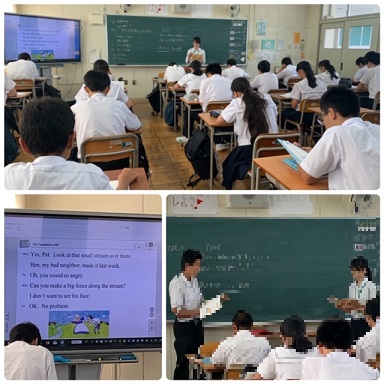 単元「Let's Reed 1 “The Carpenter's Gift”の学習を進めました。登場人物の心情に合わせて実際の劇のように演じるつもりで音読していきます。まずは、生徒代表と先生が演じながら、注意ポイントを説明してもらいました。