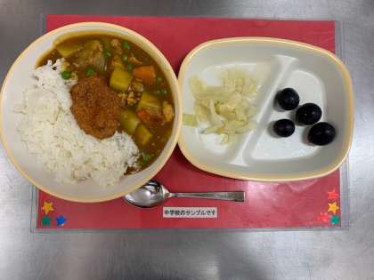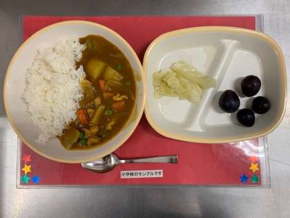 今日の給食は、「牛乳、チキンカレーライス、キャベツのピクルス、ぶどう(巨峰)」です。中学生は加えて「一口ヒレカツ」がつきます。