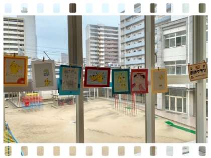 小学生の創作クラブの作品が、渡り廊下に展示されています。
