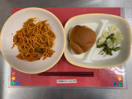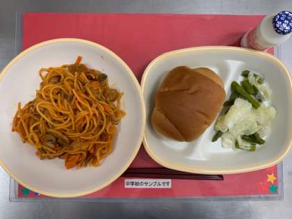 今日の給食は、「黒糖パン(小)、牛乳、イタリアンスパゲッティ、グリーンアスパラガスとキャベツのサラダ」、中学校は加えて「発酵乳」がつきます。