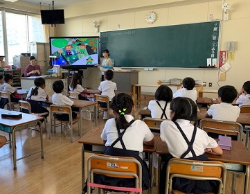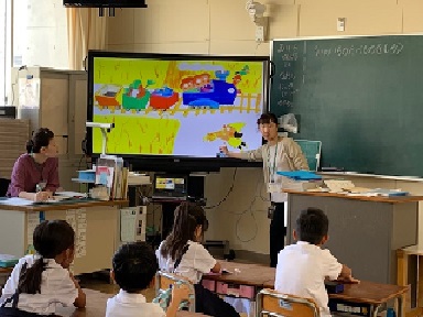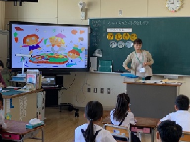 最初に、電子黒板を活用して、手作りのデジタル紙芝居形式で、3つの色の食品についてお話ししてもらいました。1年生児童は、興味深く見ていました。1時間の学習を通して、「げんきなからだ」を合言葉に3色の食品をバランスよく食べることの大切さを学びました。