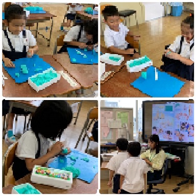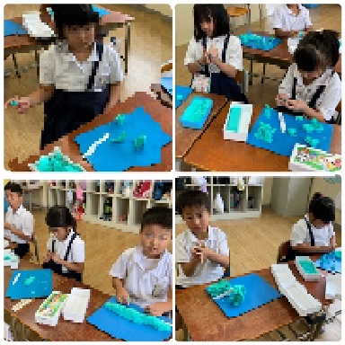 2組も同じ内容で図工の授業を進めています。粘土でいろいろ作成している傍ら、順番に「たし算の暗算テスト」もしていました。