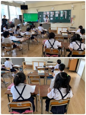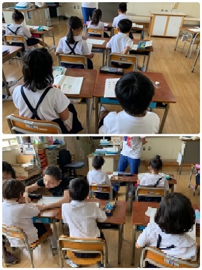 1年1組の国語の授業の様子です。今日は、漢字の成り立ちの学習をしていました。「山」とか「木」など、形からできた漢字について教えてもらいました。